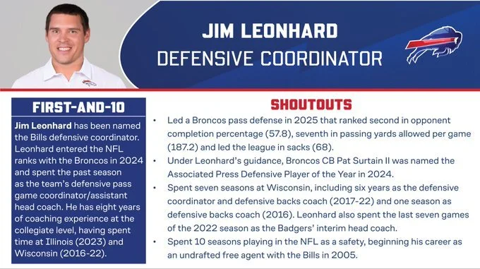 Over the weekend, it was announced that Buffalo hired one of the hottest names in the DC market, Jim Leonhard. Leonhard spent the last two seasons with the Denver Broncos, starting as their Defensive Backs Coach and Pass Game Coordinator before being promoted to their Assistant Head Coach and Defensive Pass Game Coordinator in 2025. Prior to Denver, he was in the college ranks with a year in Illinois as a Senior Football Analyst following a seven-year run in Wisconsin. Leonhard started as a Defensive Backs Coach, moved into the Defensive Coordinator role (17-22), and finished the 2022 season as the interim Head Coach after Paul Chryst was fired.