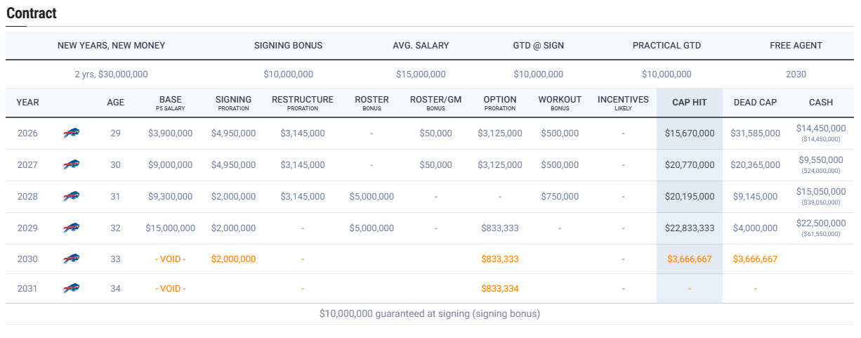 Ed Oliver - Oliver is currently in year 3 of the 4-year/$68 million rookie extension he signed in 2023. His cap hit rises to $23.9 million this season and $25.7 million next season to finish out the deal. I know Oliver has had some injuries, so there is a risk to extending him. I also believe he will thrive in Jim Leonhard’s defense, and that his injury history can help the Bills add two more years and lower that cap hit and AAV to a more manageable number. Below is a breakdown of what a 2-year extension, adding $30 million in new money and two void years, could look like for Oliver. His AAV would lower to $15 mill, and his cap hit would be about $8 million this year and $5 million next year. The roster, option, and workout bonuses can be tweaked, and it would adjust the salary cap hit. I’m not a huge fan of adding void years, but in this situation, it's only adding $3.6 million in dead money in the 2030 season if they don’t tinker with his contract again. It also leaves the team a reasonable out after the 2028 and 2029 seasons if things are not going as well as I expect them to.