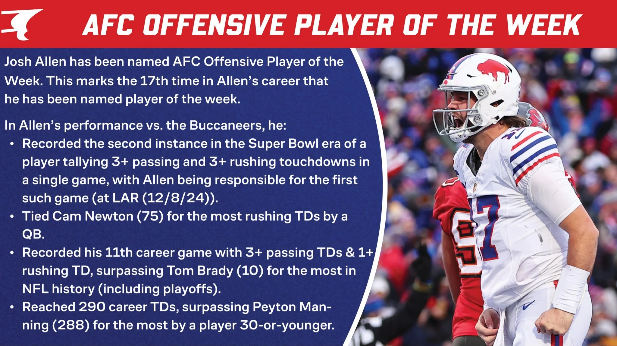 Breaking Records: Josh Allen (290) passed Peyton Manning (288) for most total touchdowns by a player 30-or-younger with a six touchdown performance vs the Buccaneers on his way to his 17th AFC Offensive Player of the Week award. He passed Tom Brady (10) for the most career games (including playoffs) with 3+ passing and 1+ rushing touchdowns. Allen needs one more rushing touchdown to break a tie with Cam Newton (75) and move into first place all-time for rushing touchdowns by a quarterback in the regular season.