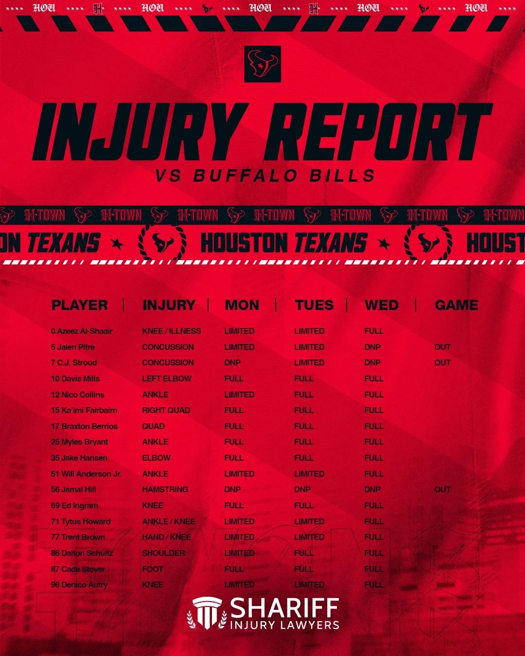 Injuries: Curtis Samuel, Dalton Kincaid, and Mecole Hardman have been ruled out for the Bills. C.J. Stroud and Jalen Pitre are both still in concussion protocol and will miss their second straight game.